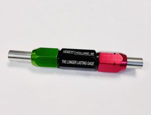 Wire Type Design- Wire type gage blank also known as reversible or Pin gages. The gage mounts in a Double or Single-ended collet handle. The Go gage is identified with a Green collet nut; the NoGo gage is identified with a Red collet nut which also has an annular groove cut around the hex diameter. Both gaging members can be reversed for extended gage life making this design the most economical gage design.